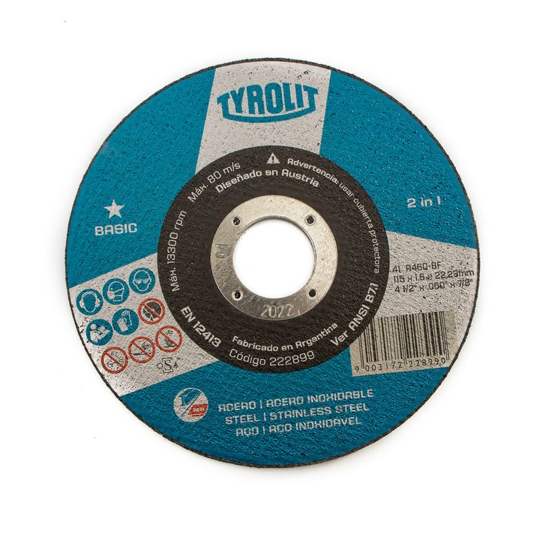 Los Discos Abrasivos para desbaste TYROLIT BASIC son discos de centro deprimido apropiados para el amolado de aceros, fundición y aceros inoxidables indistintamente, sin necesidad de cambiar de disco para uno u otro material.