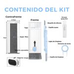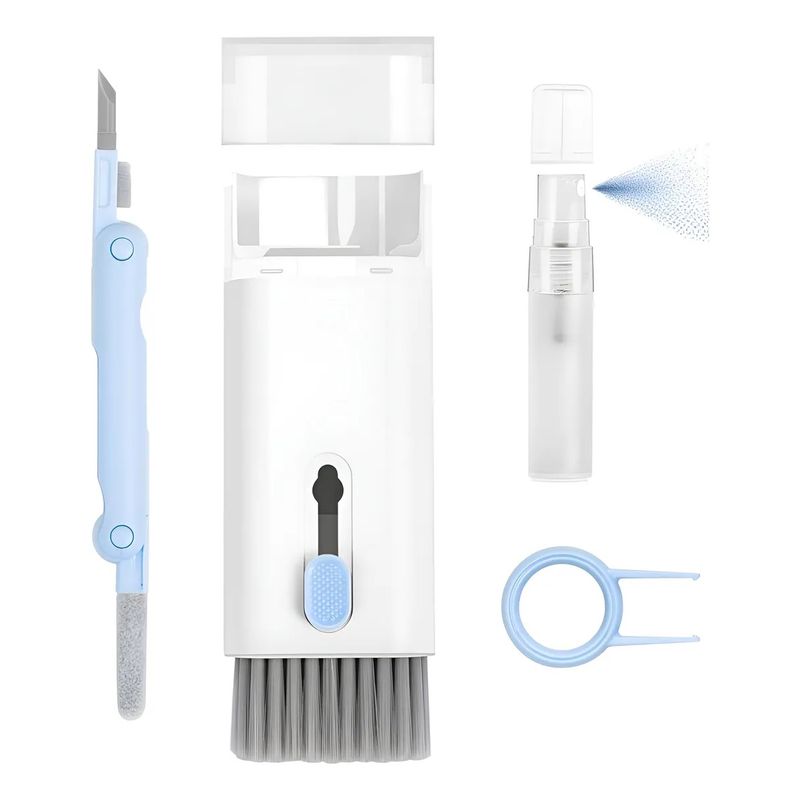 Su diseño compacto incluye 7 herramientas de limpieza especialmente pensadas para eliminar polvo, huellas y suciedad sin dañar las superficies. Viene en un práctico estuche en color celeste, fácil de transportar y guardar.
