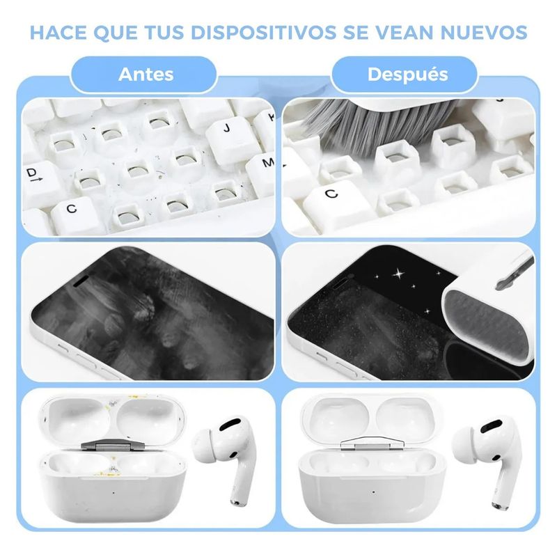 El Kit de Limpieza 7 en 1 es la solución ideal para mantener impecables tus dispositivos electrónicos como celulares, notebooks, netbooks, teclados y pantallas.