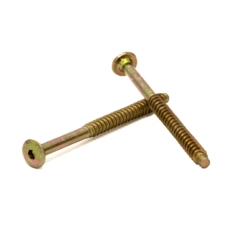 Datos Técnicos: Material: Acero bajo carbono. Terminación: zincado amarillo. Diámetro: 7Mm Largo: 90" Tipo: cabeza cónica Tornillo diseñado exclusivamente para la fijación y el armado de muebles. Rosca: parcial. Sistema de apriete: llave allen 4 Mm.