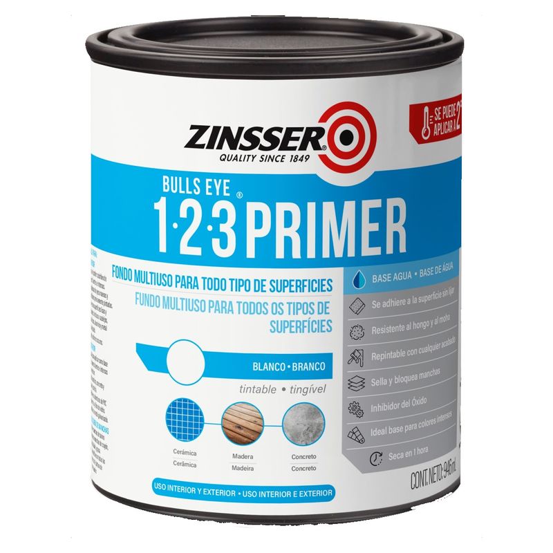 Zinsser 1-2-3 es un imprimante Sellador Base Acuosa el cual está diseñado para promover la adherencia en superficies poco porosas como: Aluminio, Galvanizado, Azulejos, Cerámico, Esmaltes Brillantes, Etc. Sella y uniforma absorción en la mayoría de las superficies porosas como: madera, madera prensada, yeso y concreto tanto en el interior como en el exterior. Posee un excelente poder cubritivo lo cual lo hace ideal para ocultar fácilmente colores intensos, su fórmula brinda un secado rápido y bajo olor.